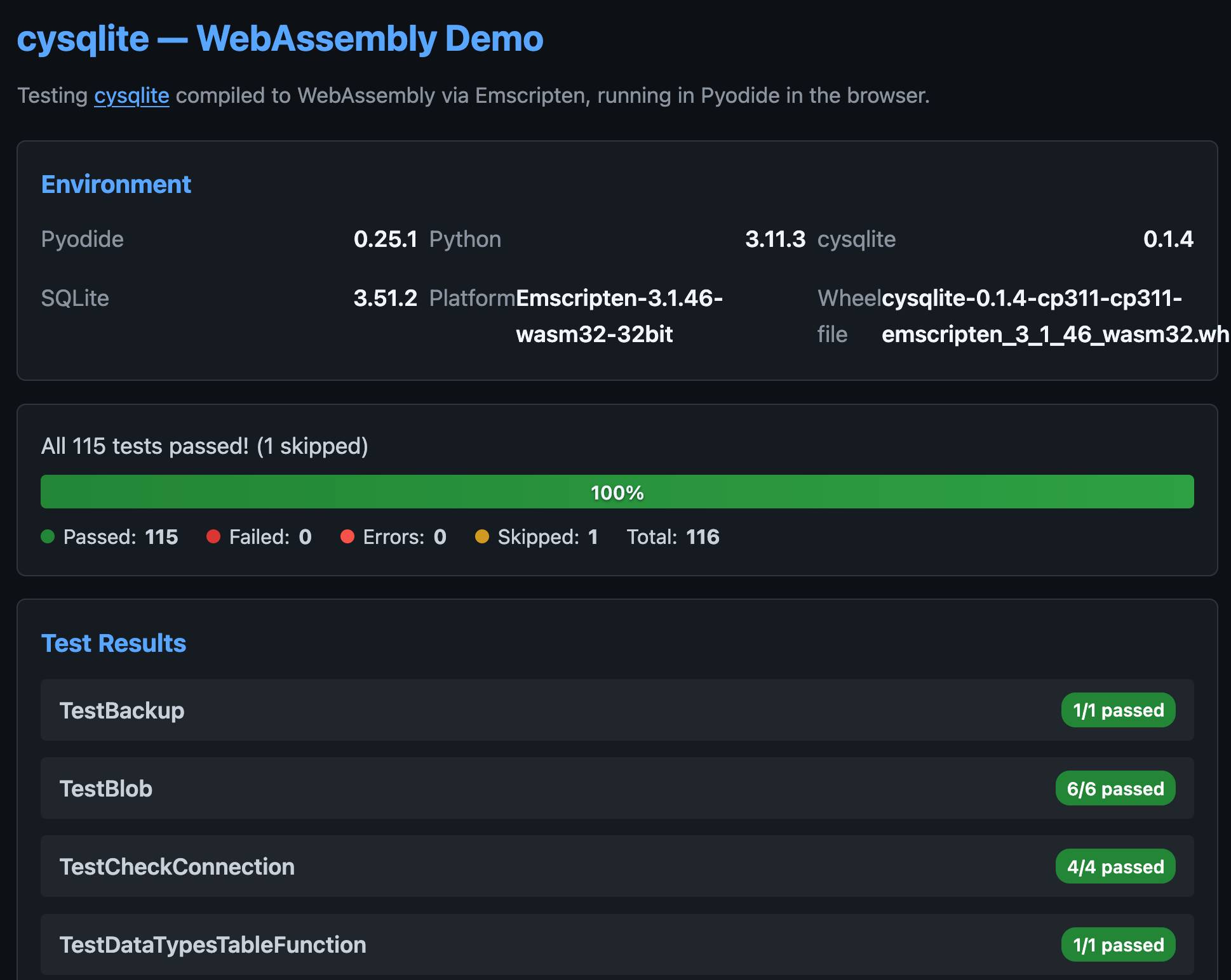 cysqlite provides a Python extension compiled from C, which means it normally wouldn’t be available in Pyodide. I set Claude Code on itand it built me cysqlite-0.1.4-cp311-cp311-emscripten_3_1_46_wasm32.whl, a 688KB wheel file with a WASM build of the library that can be loaded into Pyodide like this: