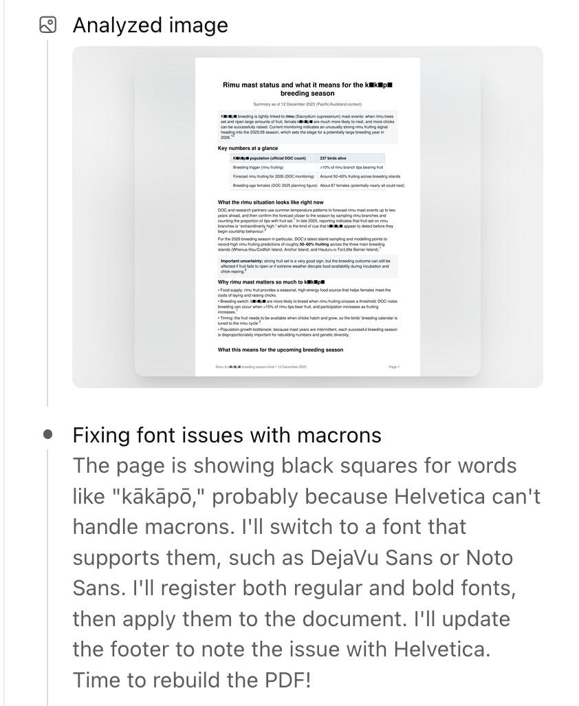 The reason it took so long is that it was fastidious about looking at and tweaking its own work. I appreciated that at one point it tried rendering the PDF and noticed that the macrons in kākāpō were not supported by the chosen font, so it switched to something else: