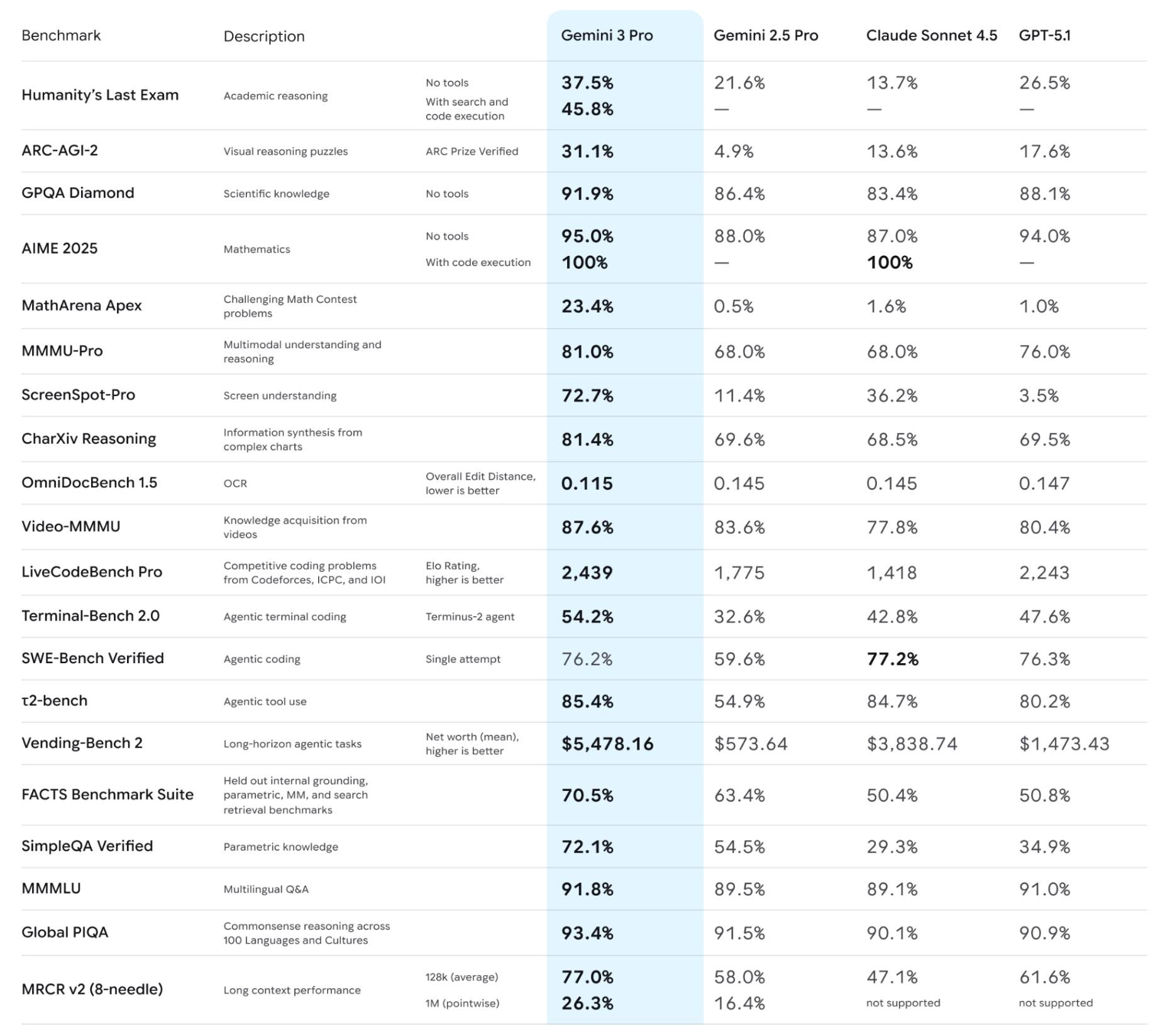 Gemini 3 Pro 91.9%, Gemini 2.5 Pro 86.4%, Claude Sonnet 4.5 83.4%, GPT-5.1 88.1%.