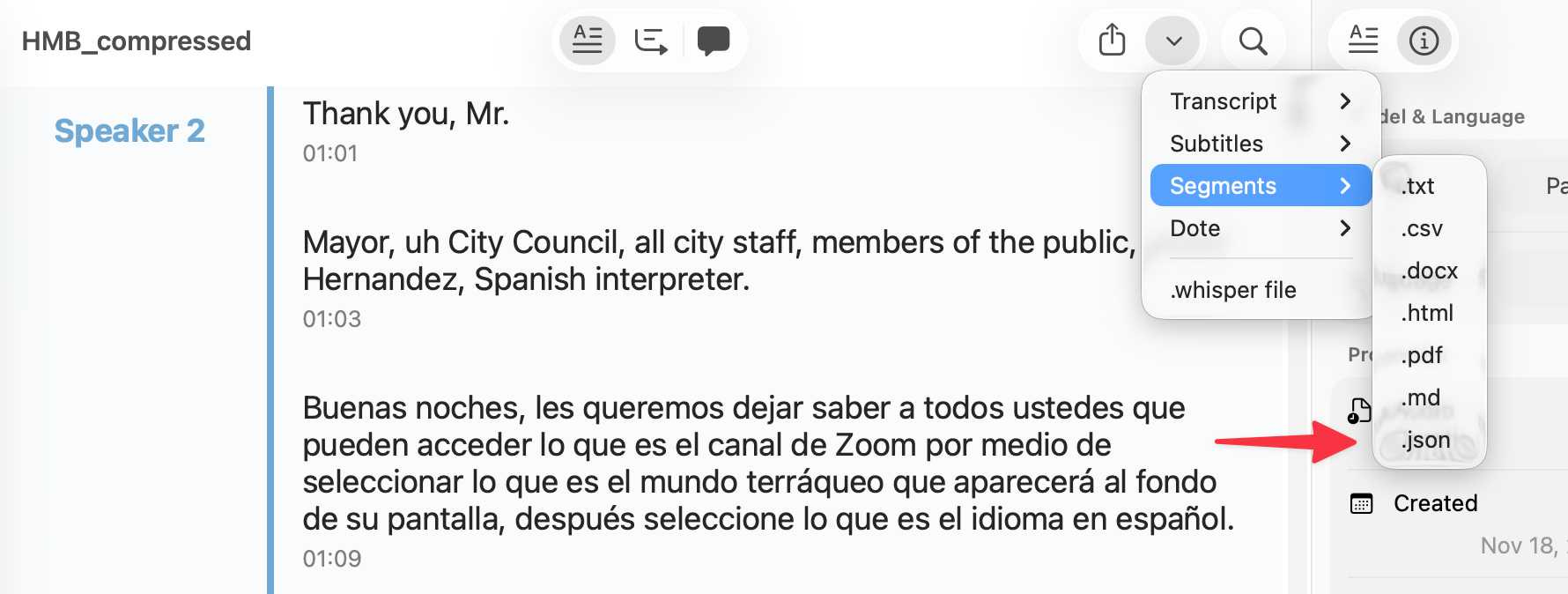 You can export the transcript with both timestamps and speaker names using the Share -> Segments > .json menu item: